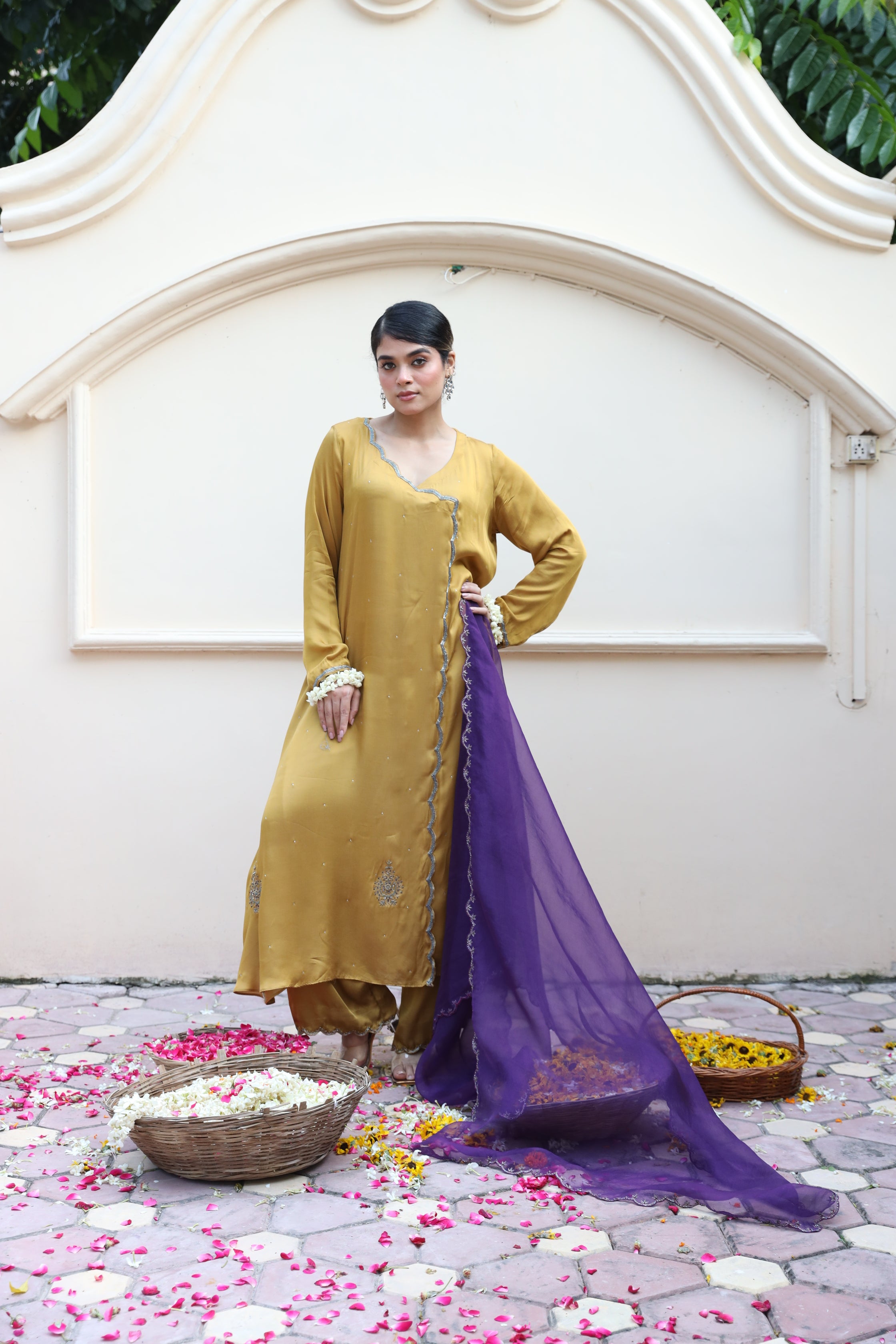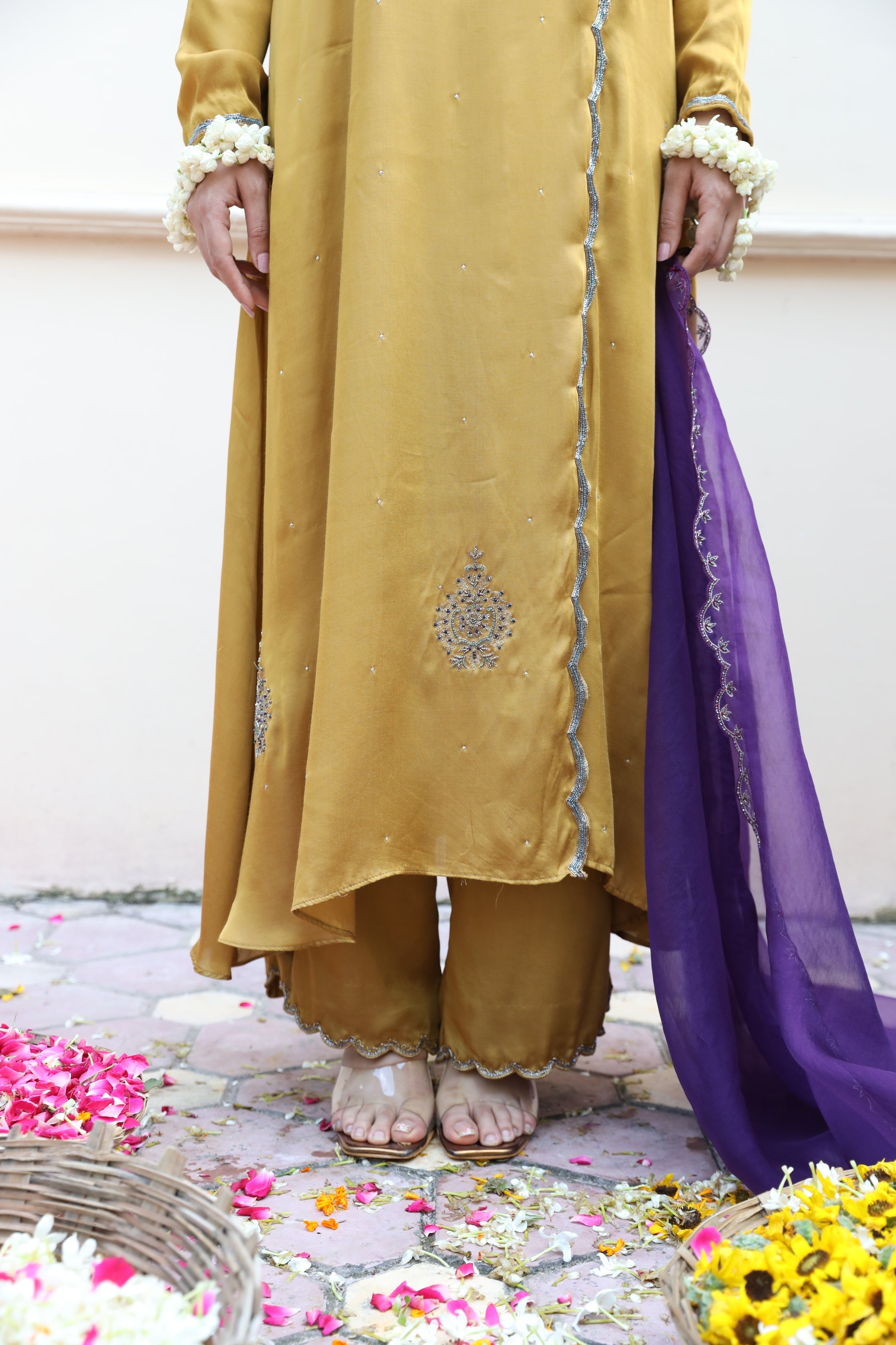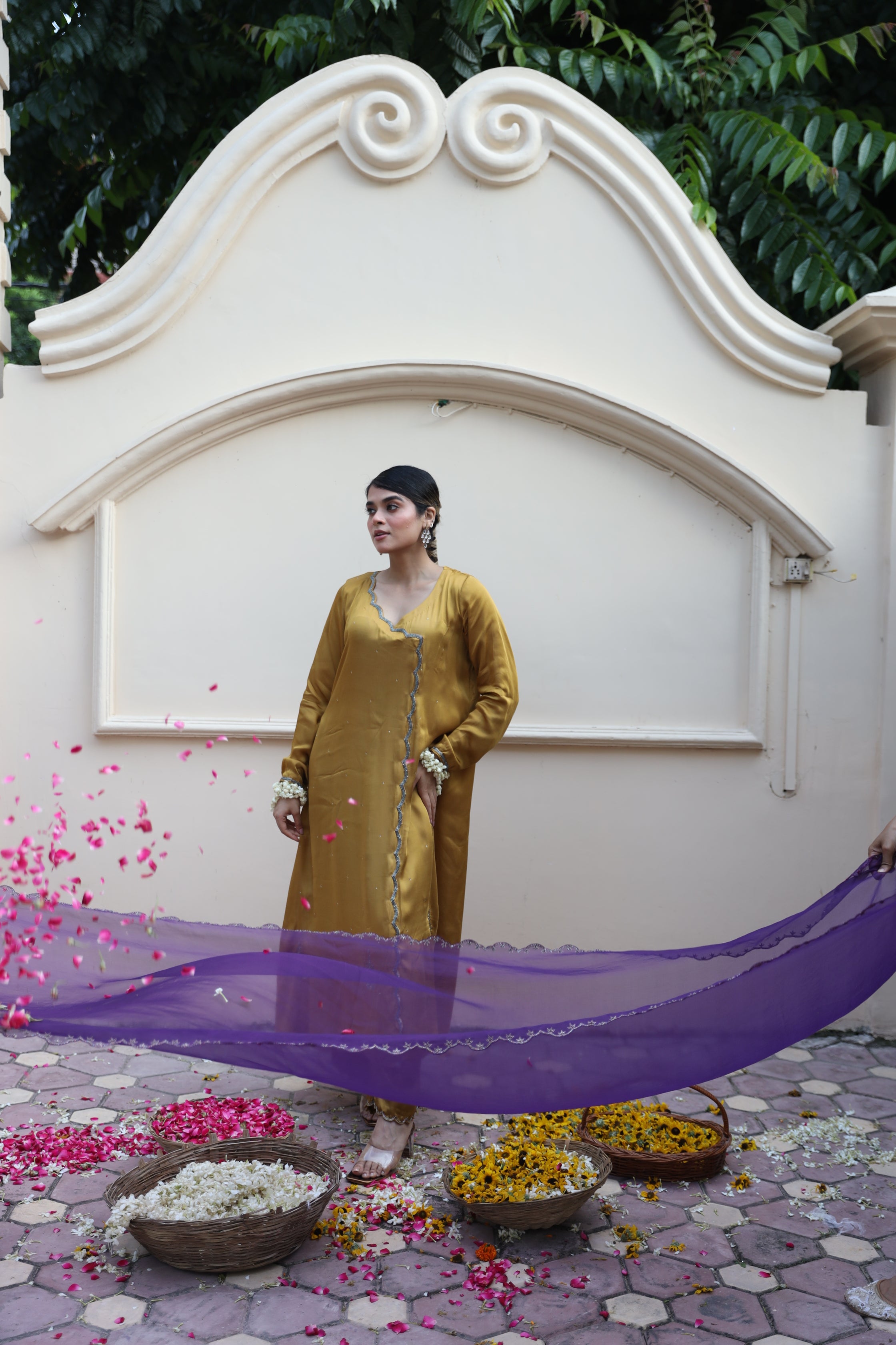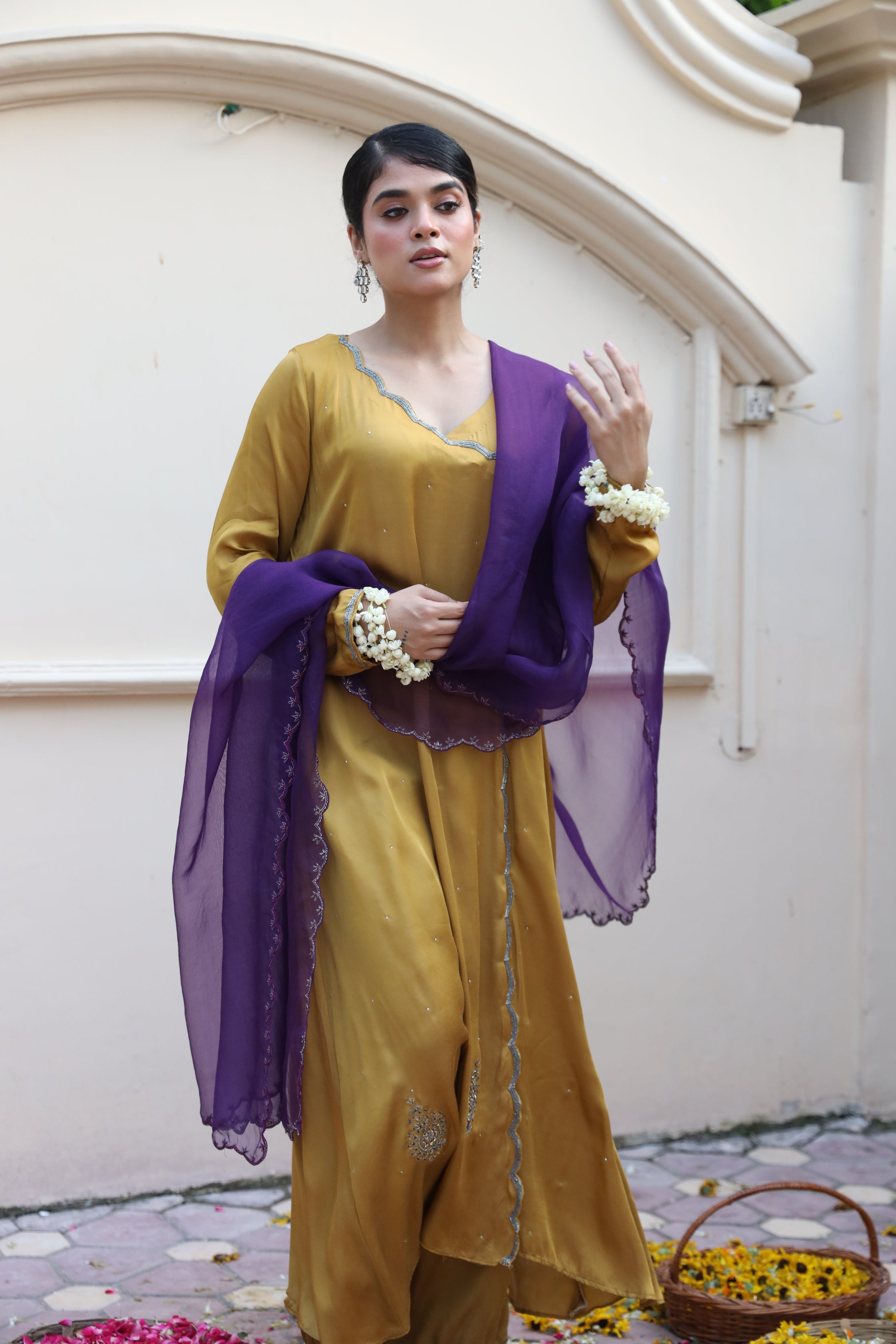Mustard Kurta Set with Contrasting Purple Dupatta