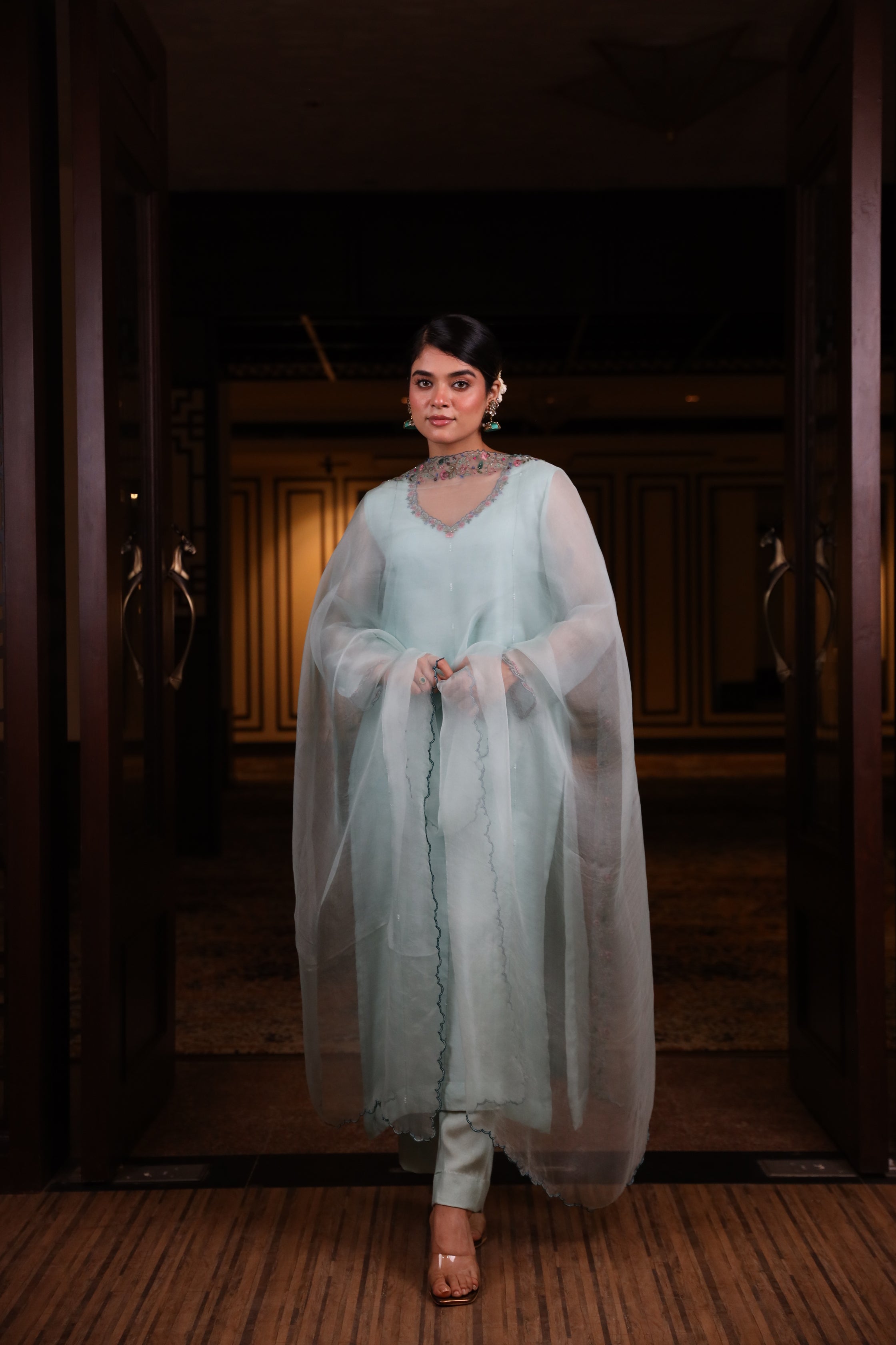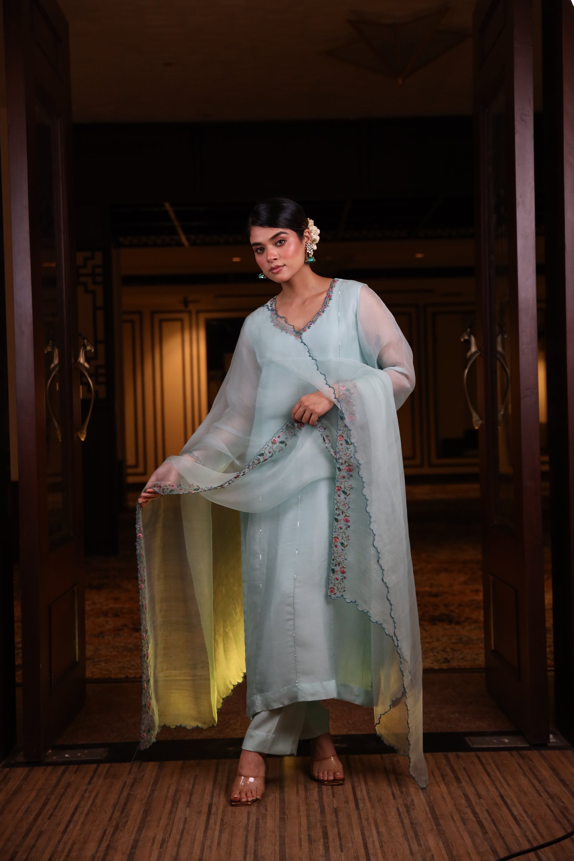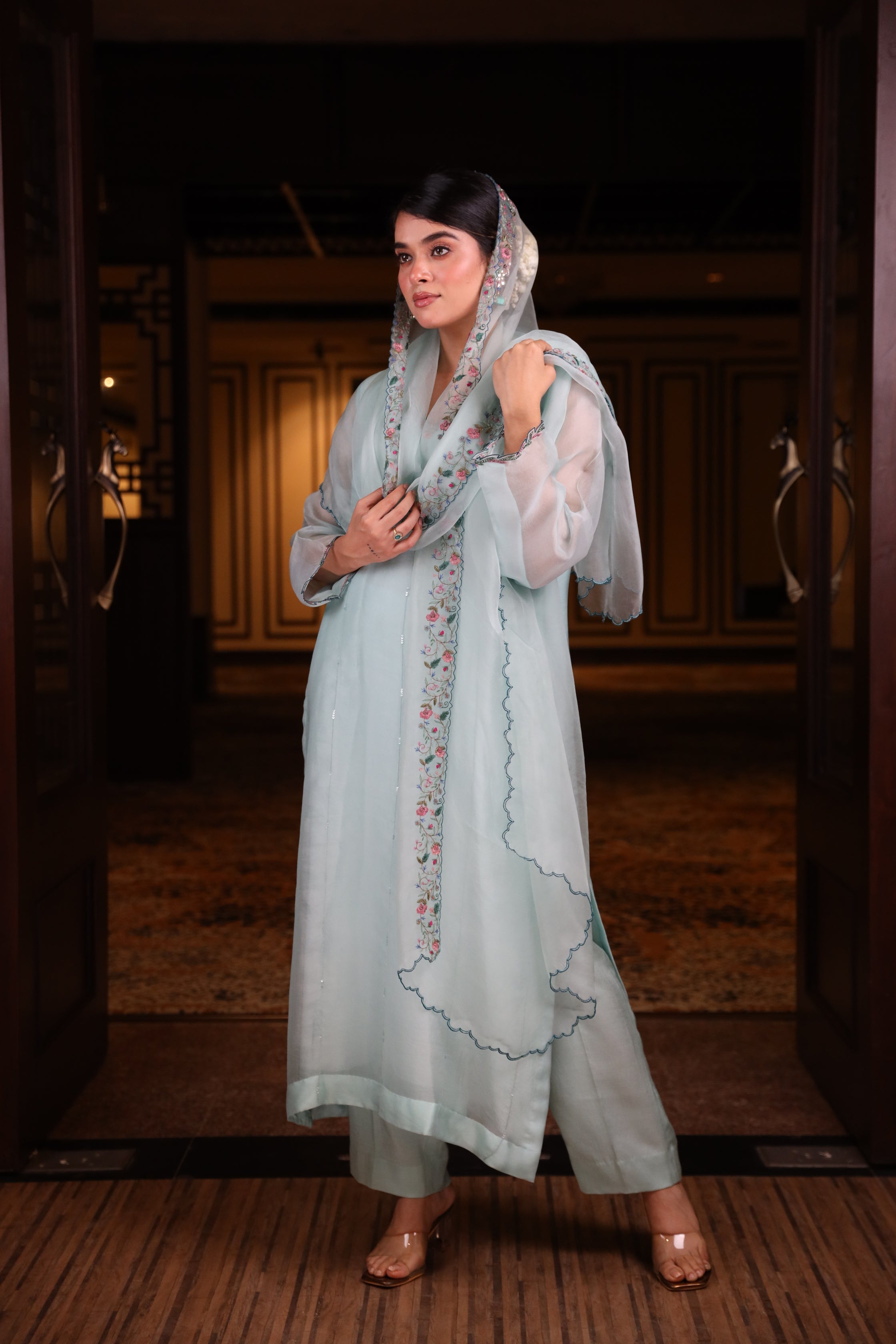 Firozi Kurta Set with Subtle Embroidery and Sheer Dupatta