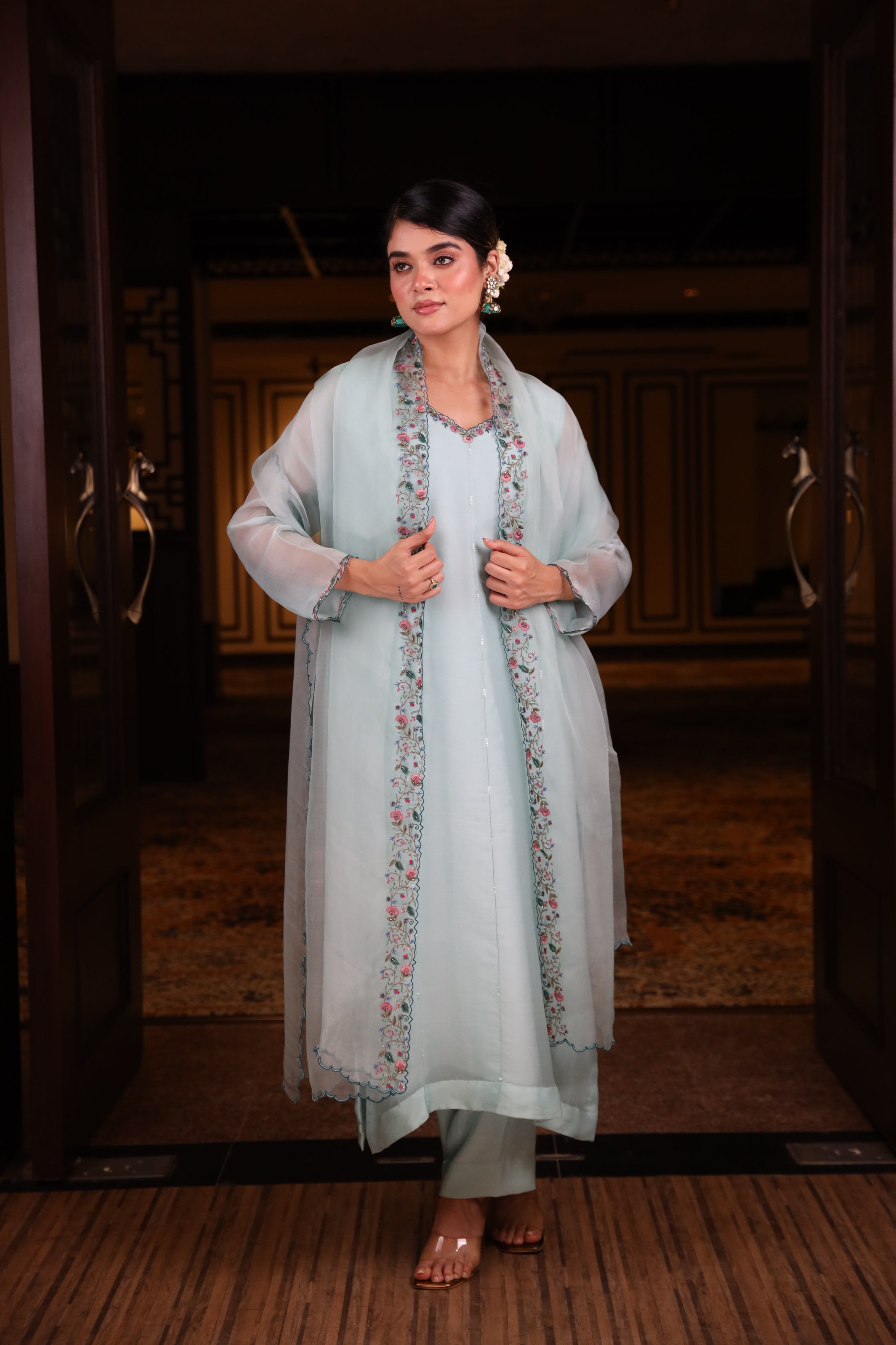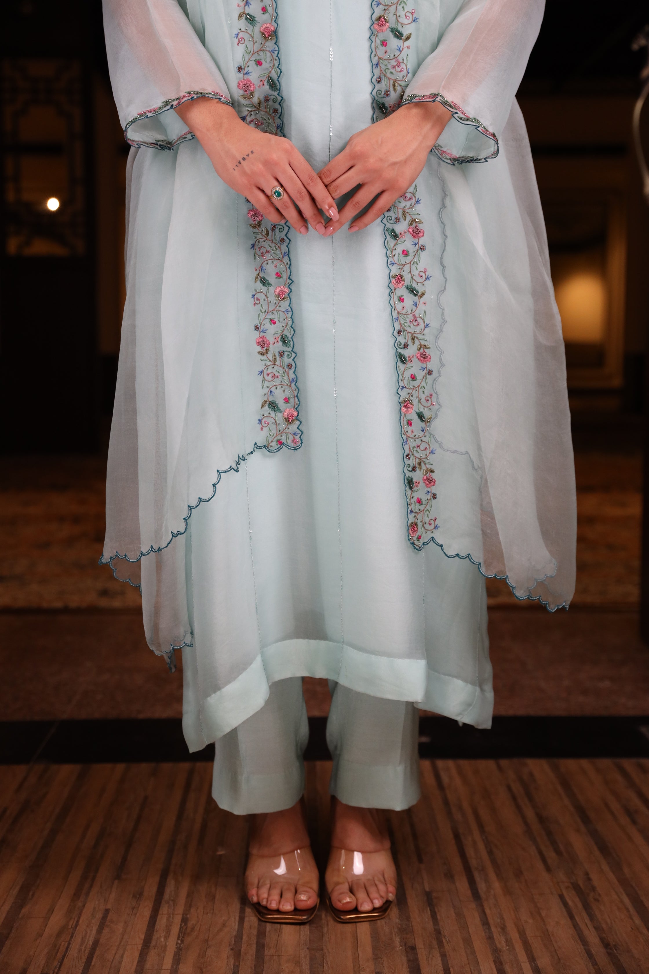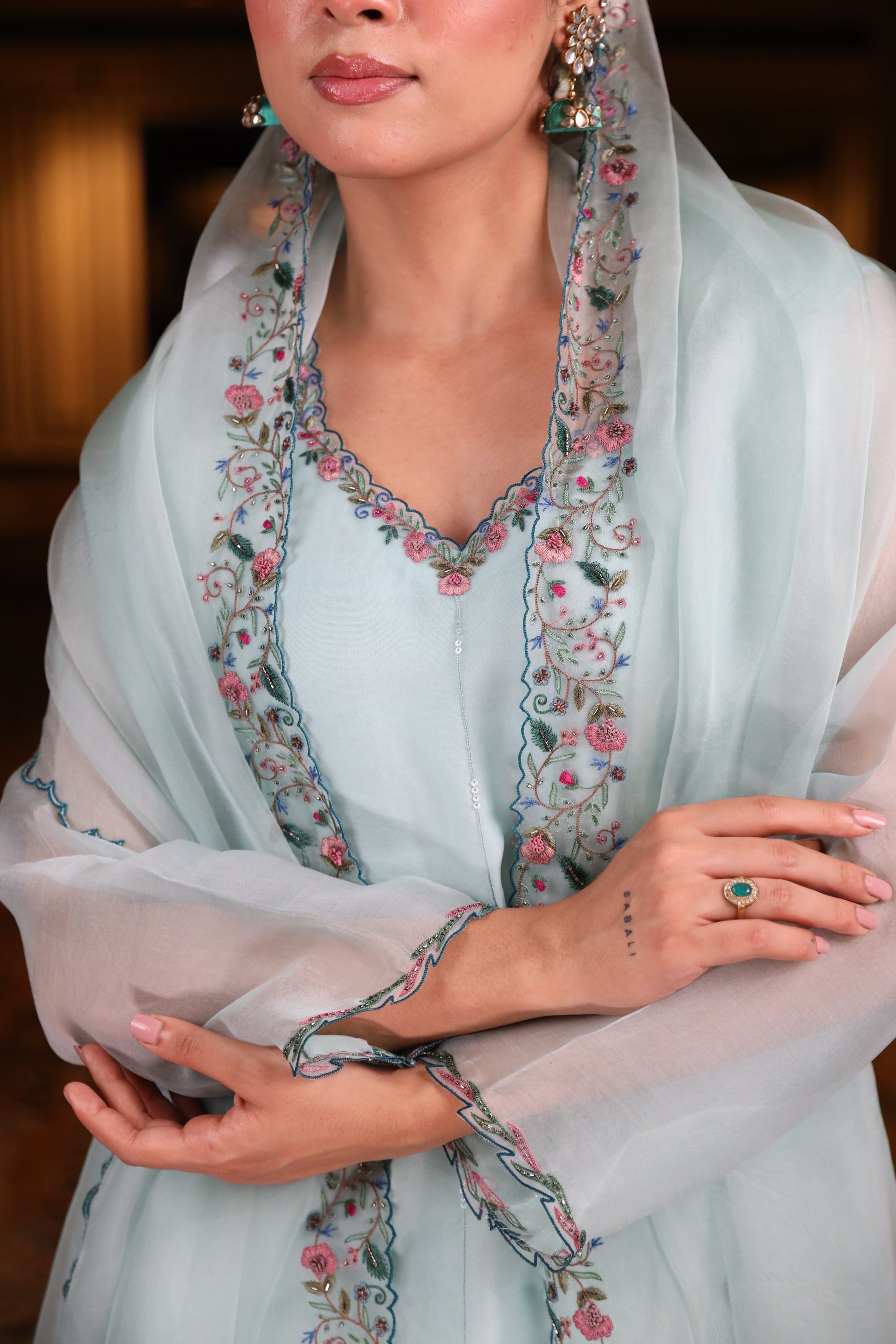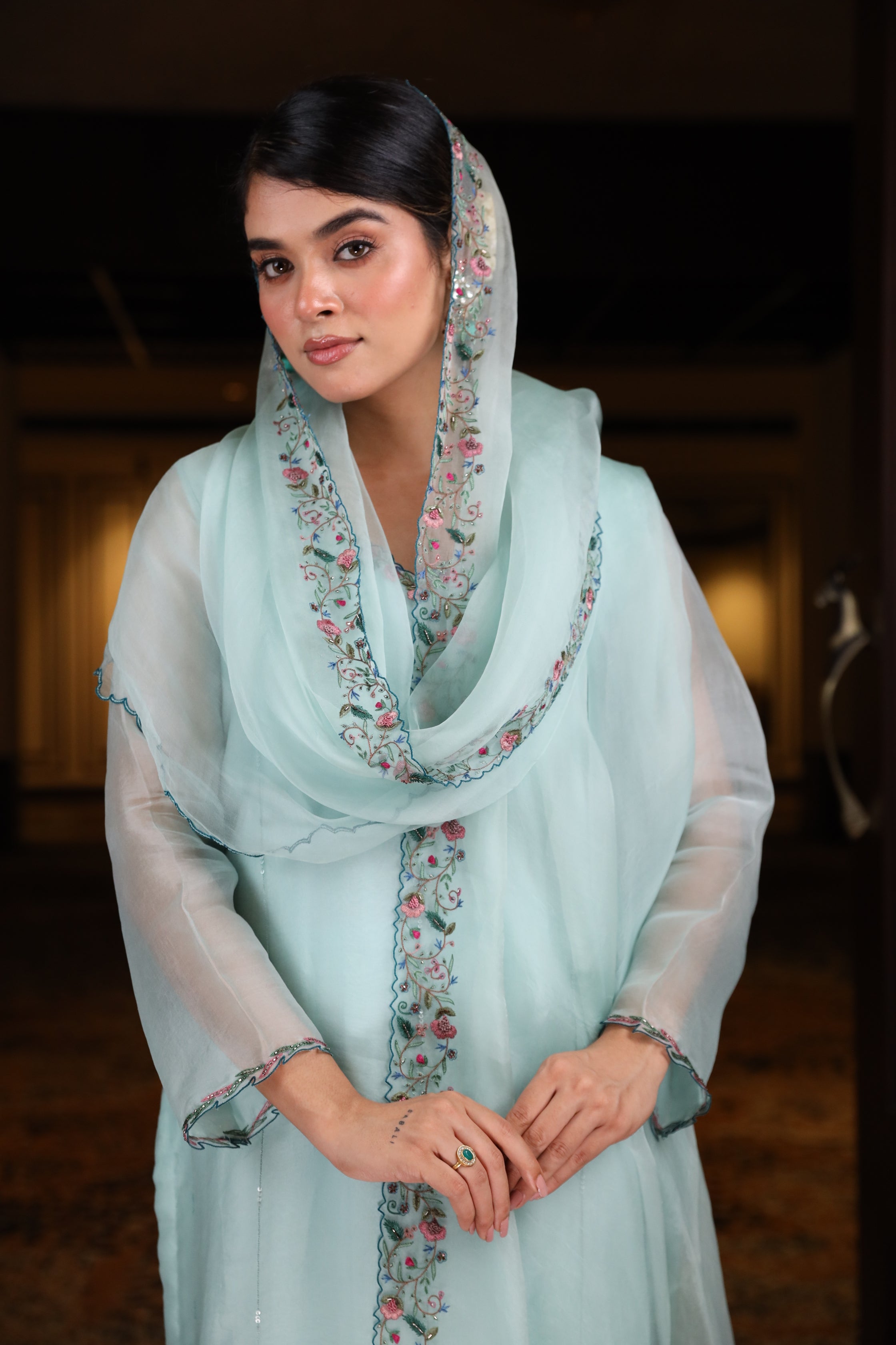Firozi Kurta Set with Subtle Embroidery and Sheer Dupatta