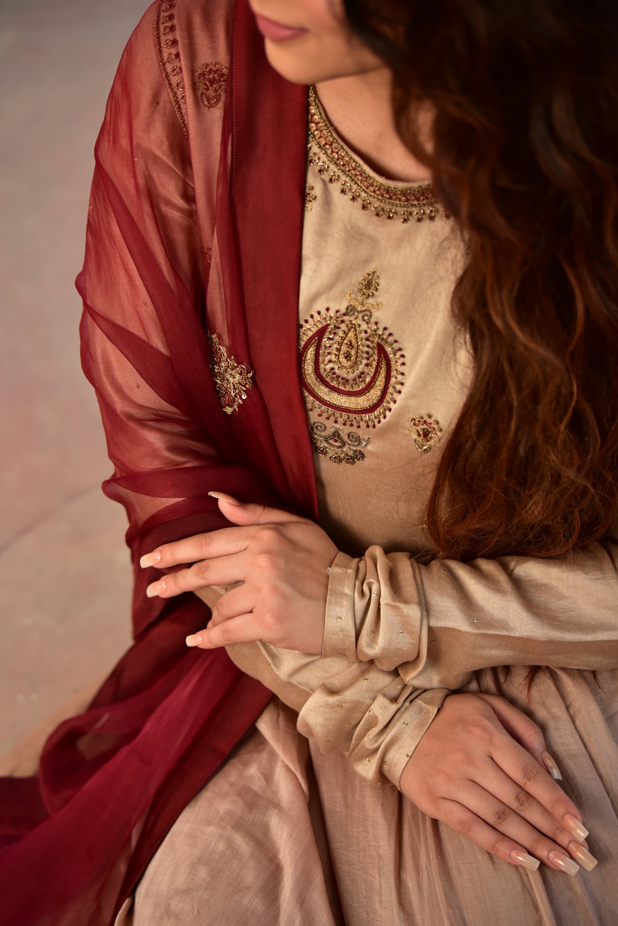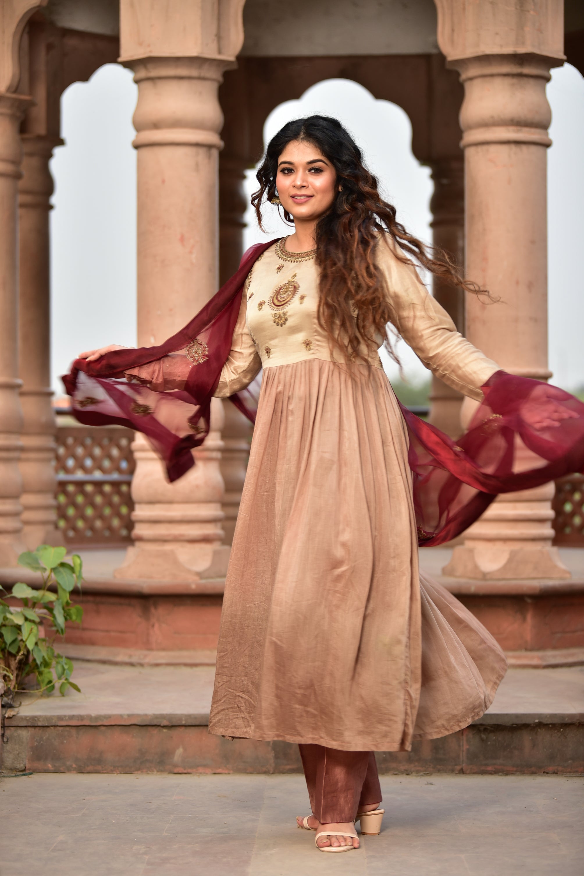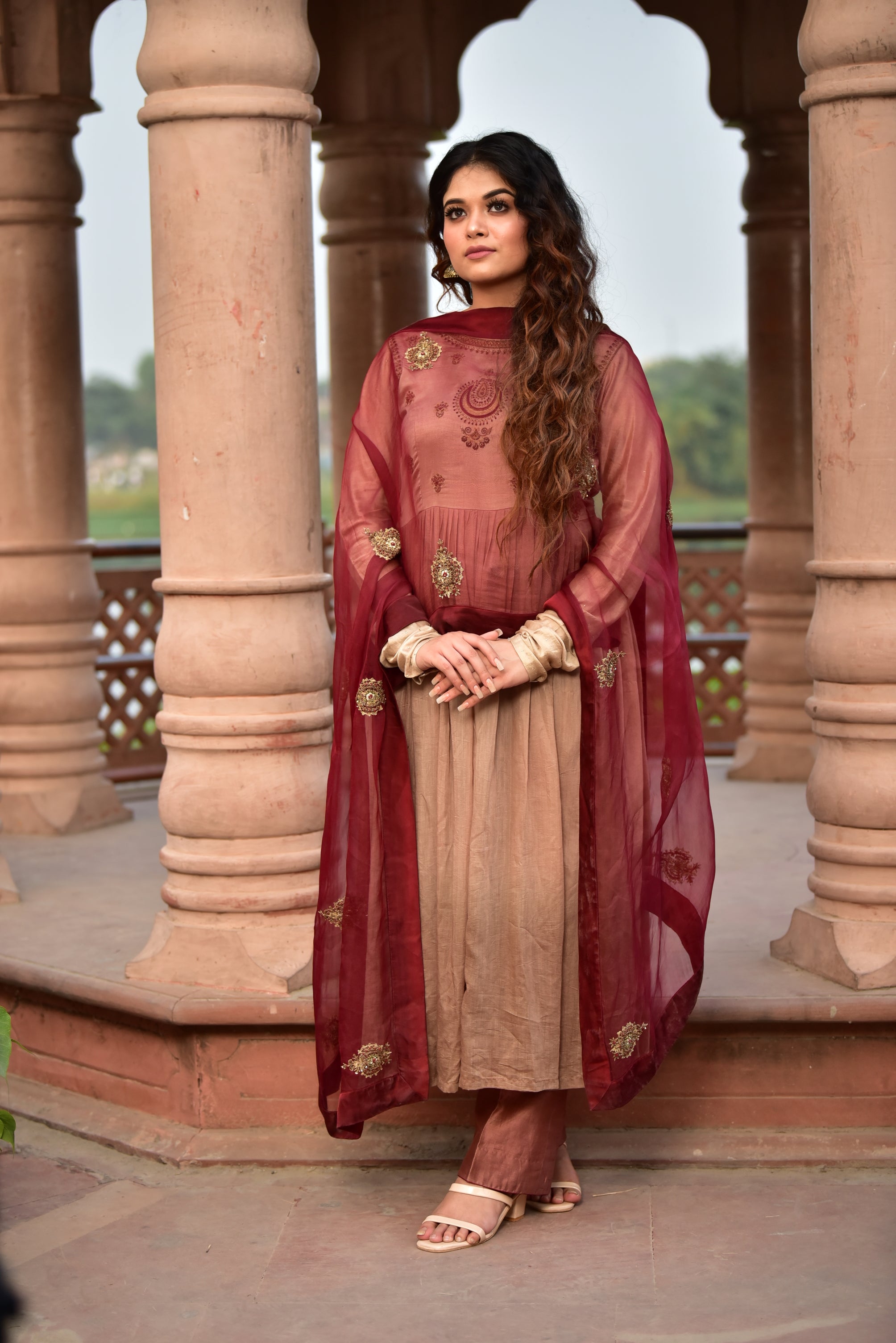 Light Brown Ombré Kurta Set with Maroon Dupatta
