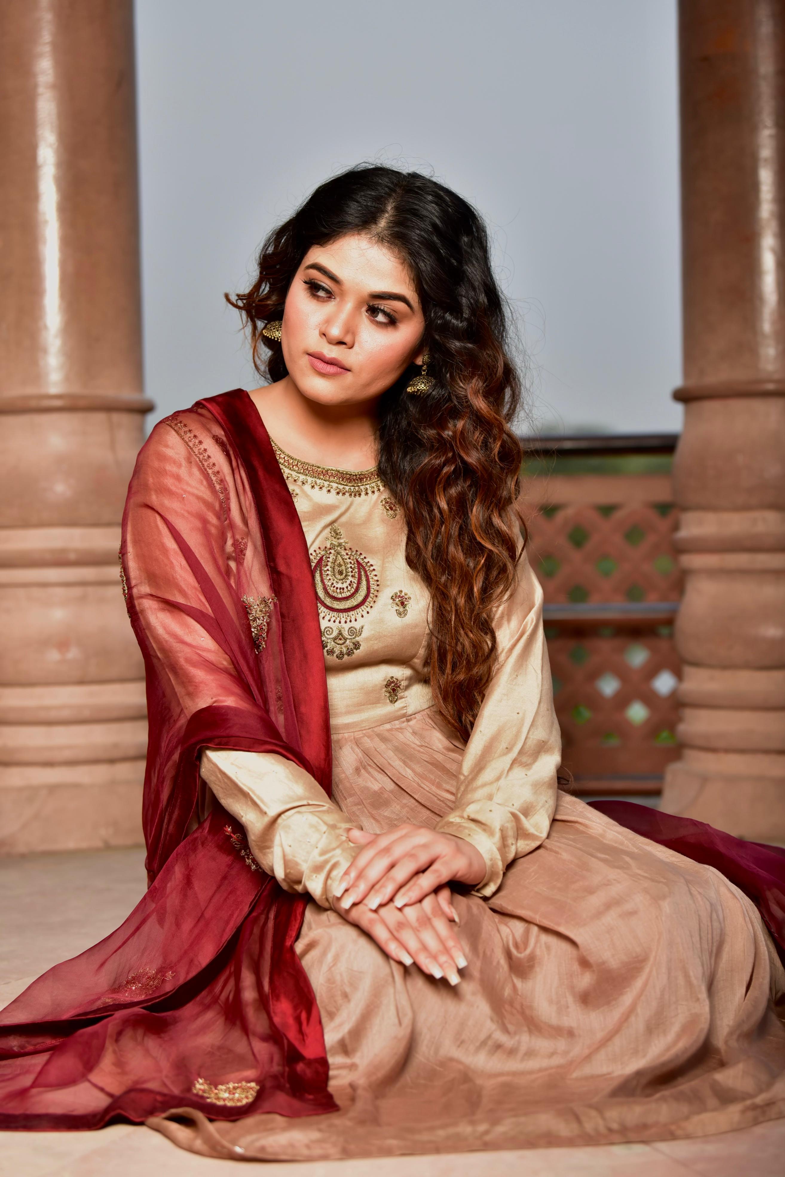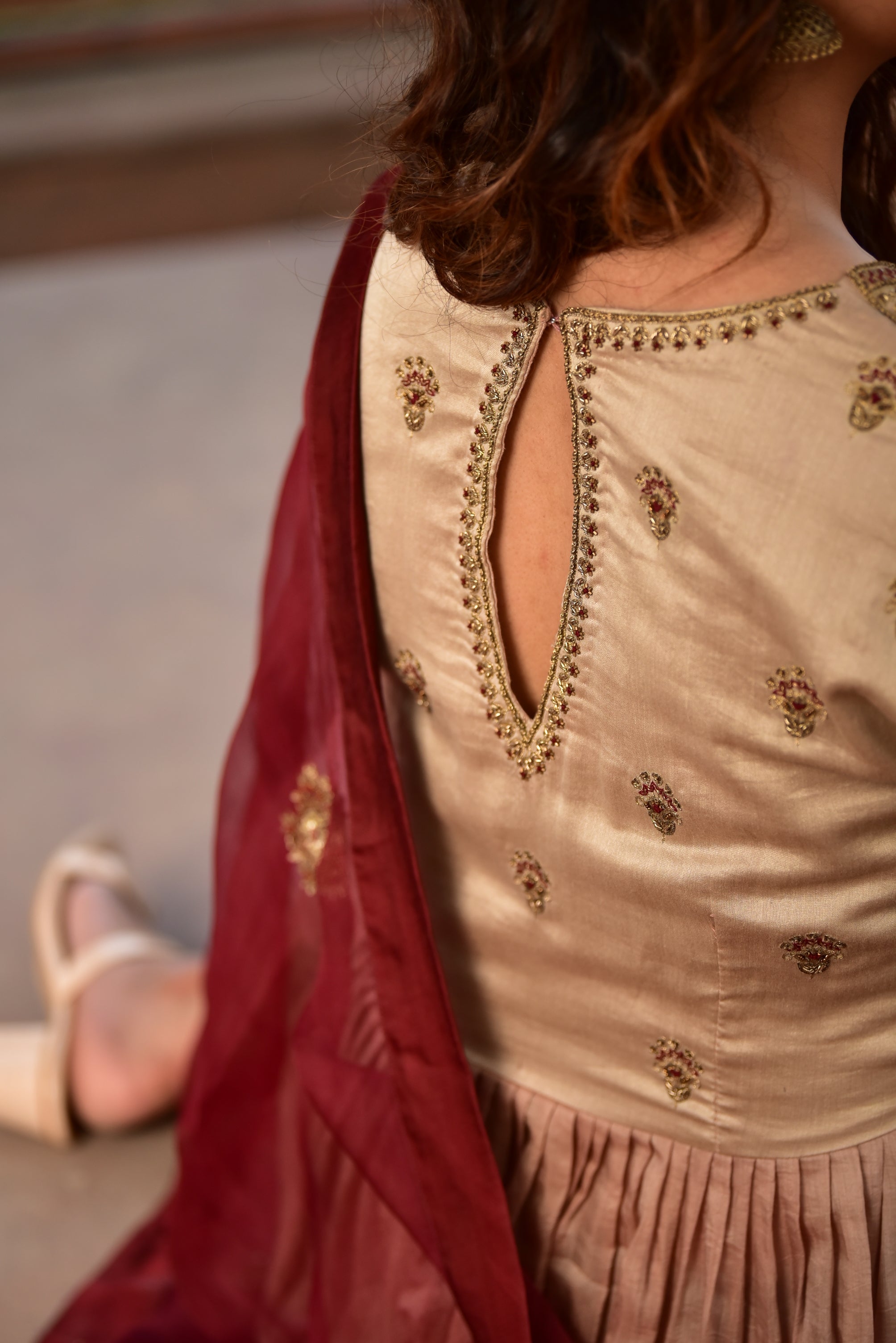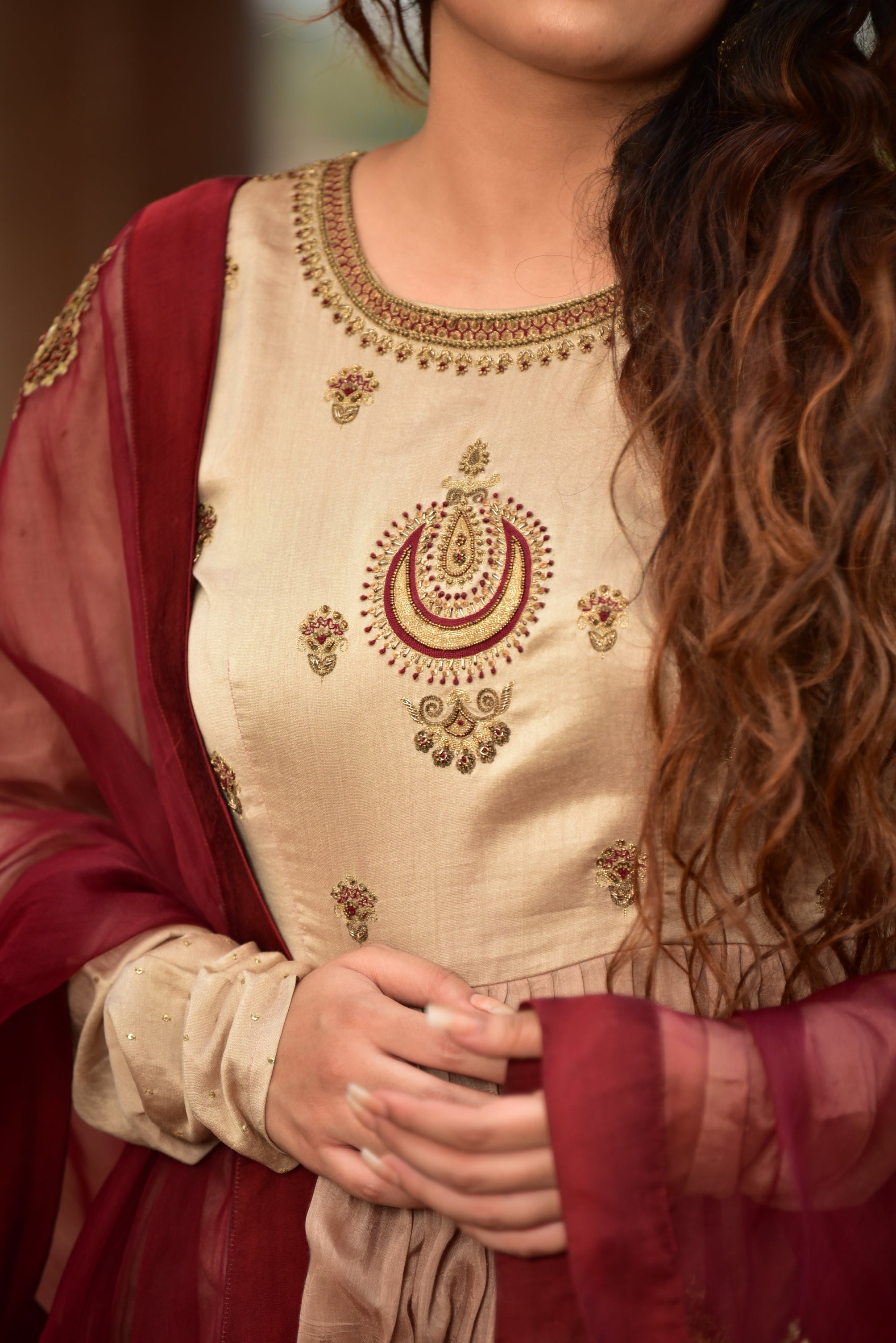 Light Brown Ombré Kurta Set with Maroon Dupatta