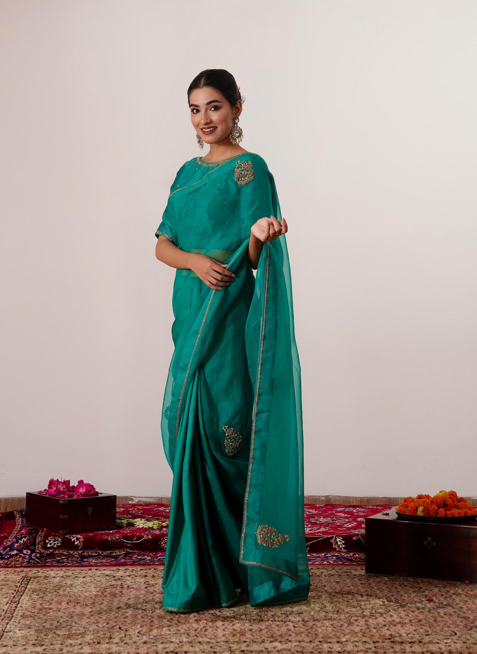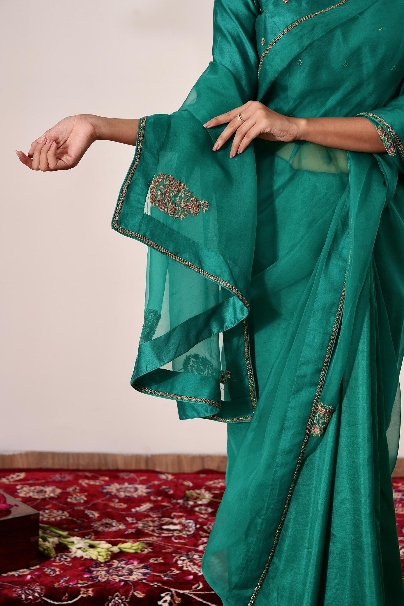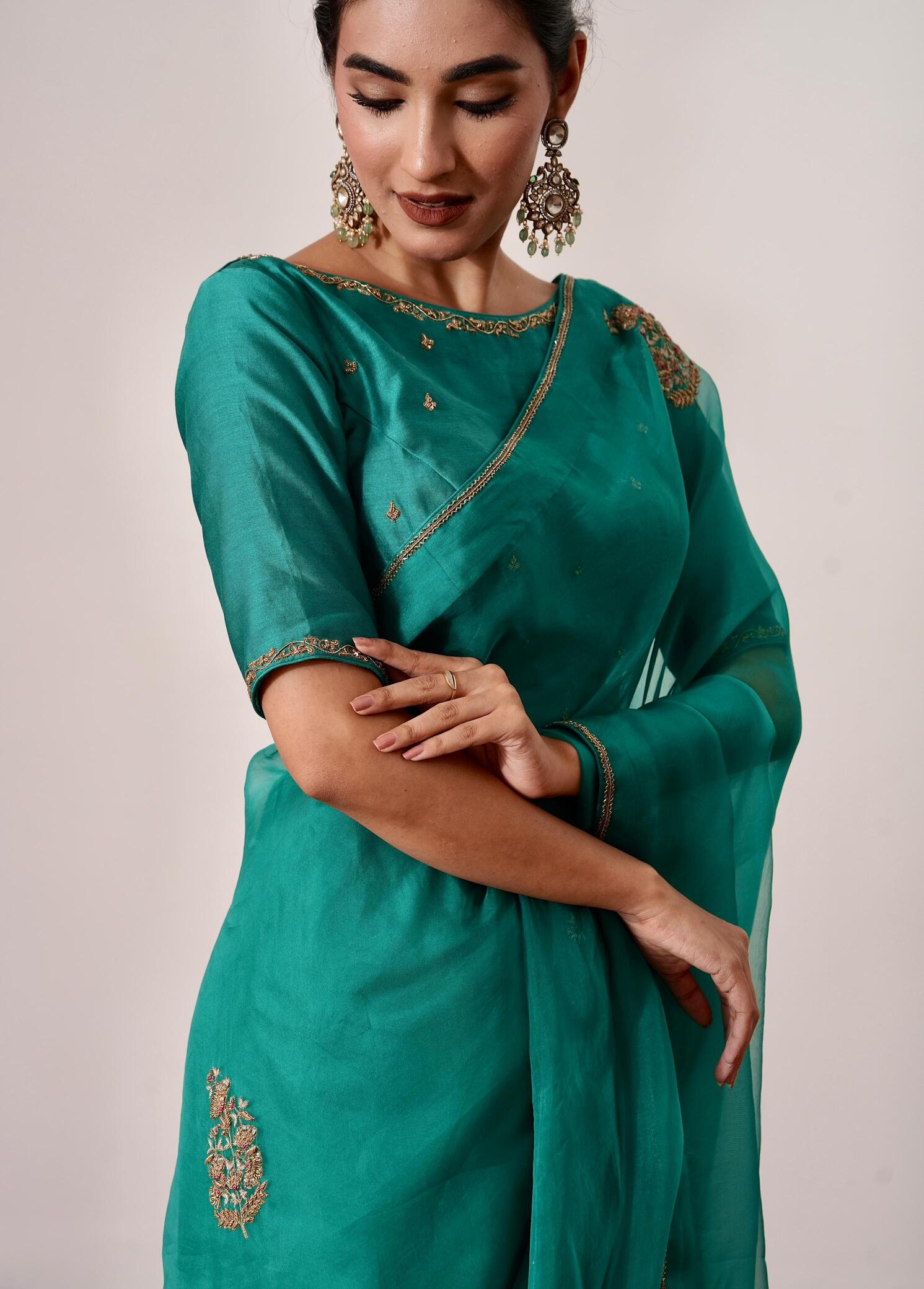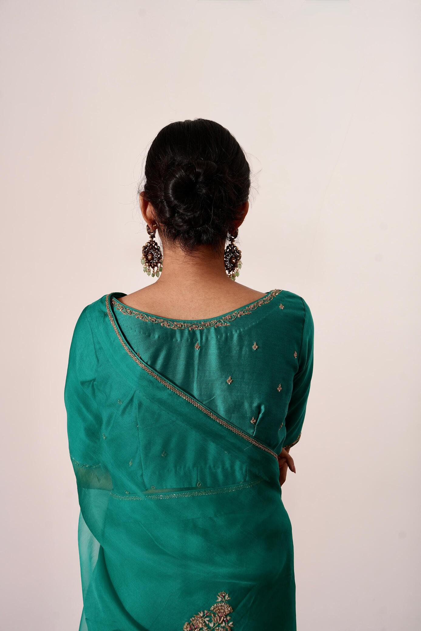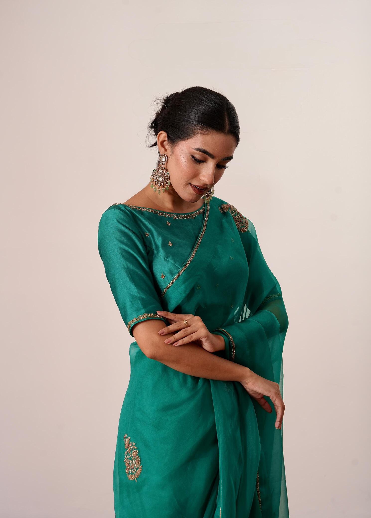 A graceful 2-piece Organza and Chanderi Silk set in Emerald Green, detailed with intricate zardozi work. A refined creation that embodies poise and timeless artistry.