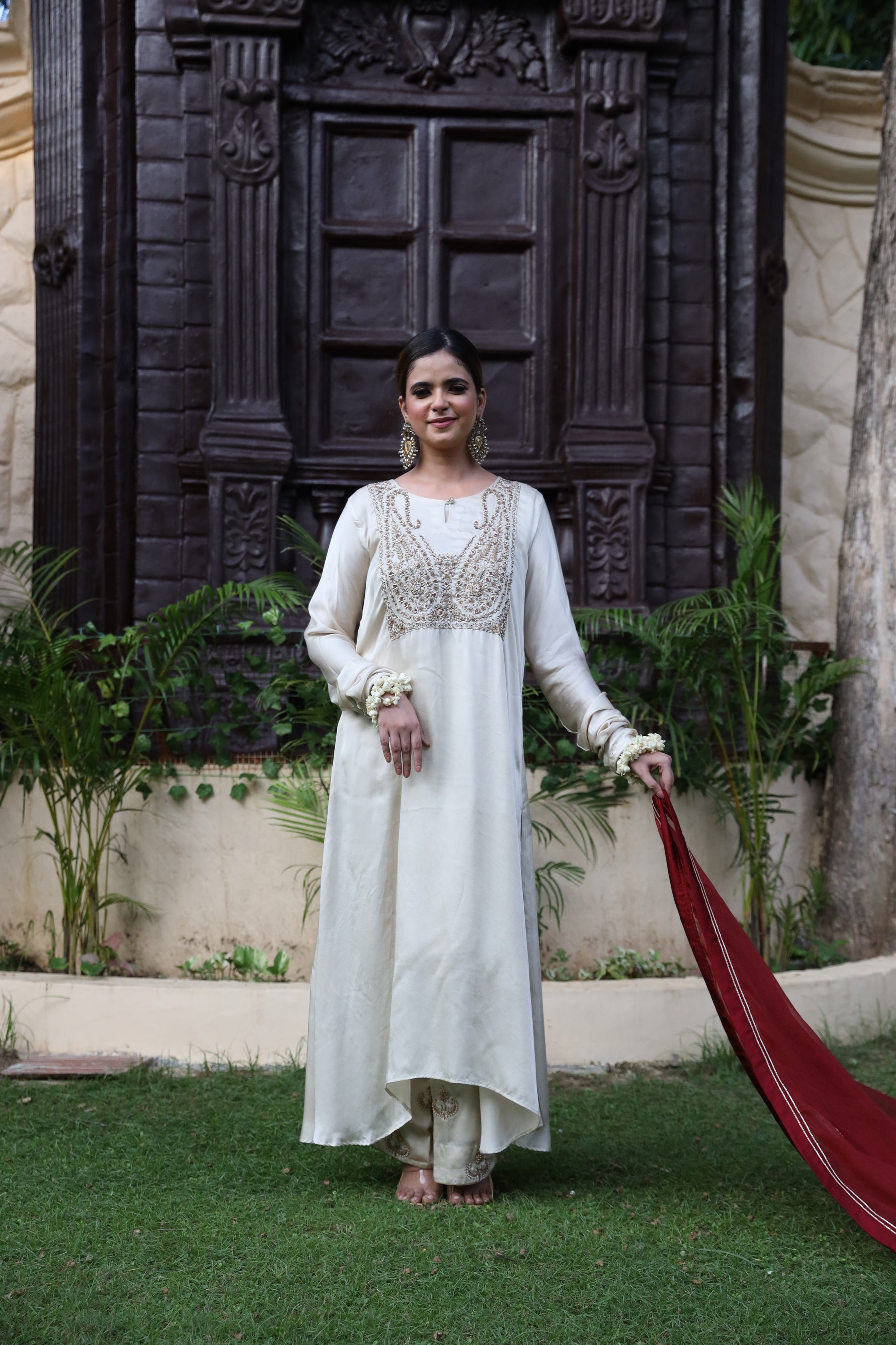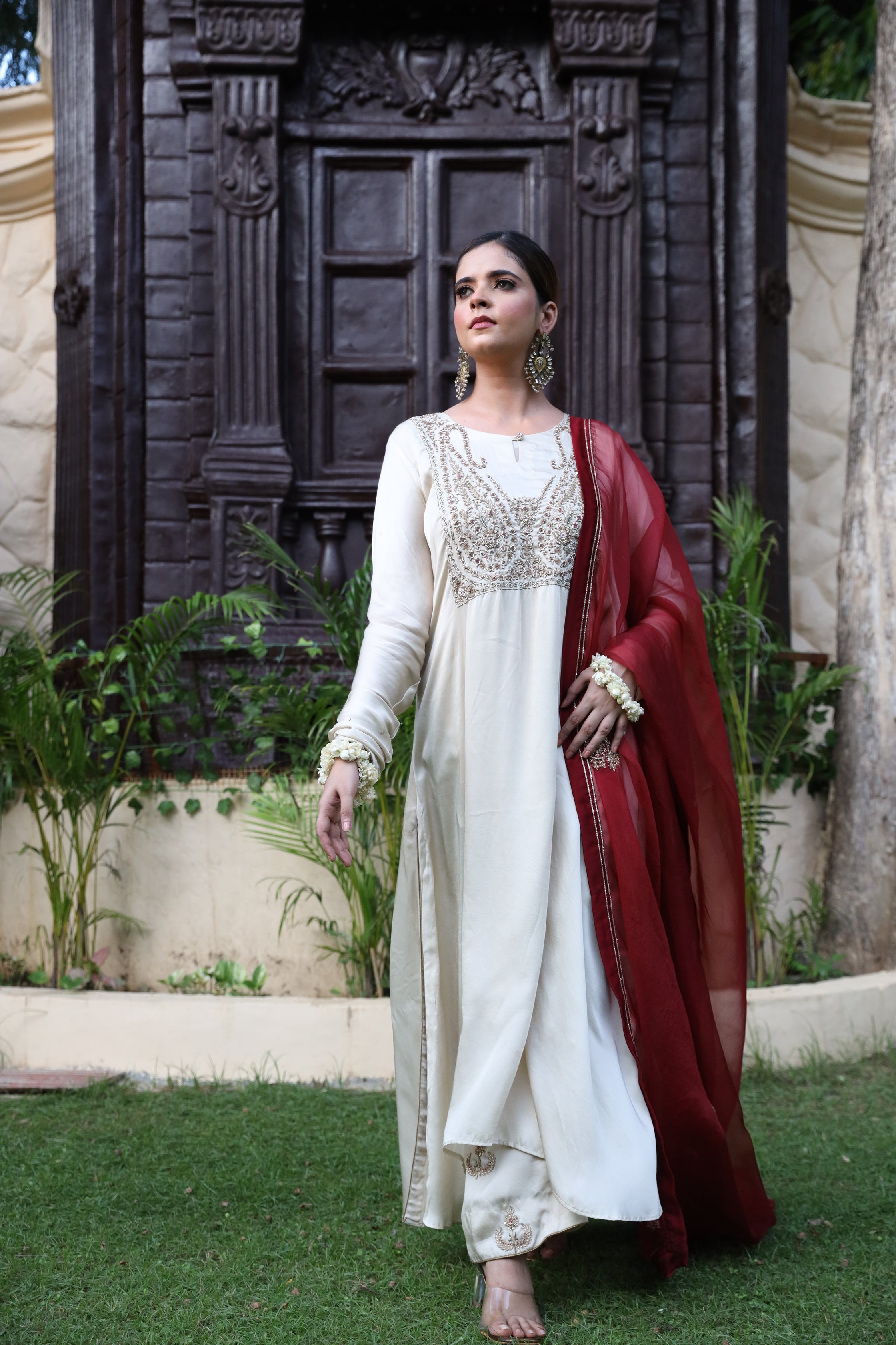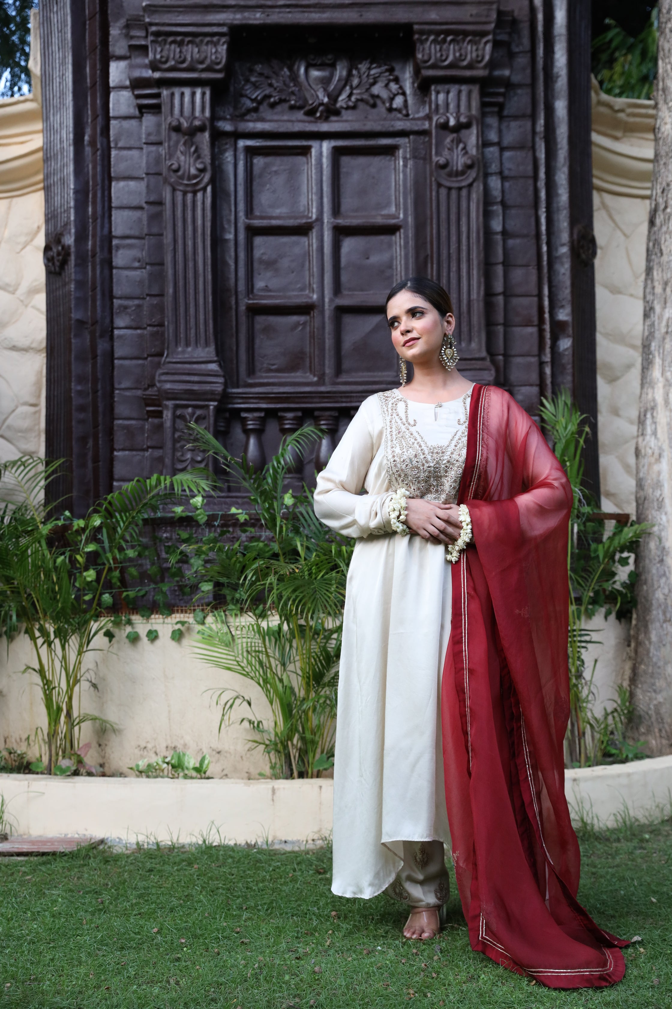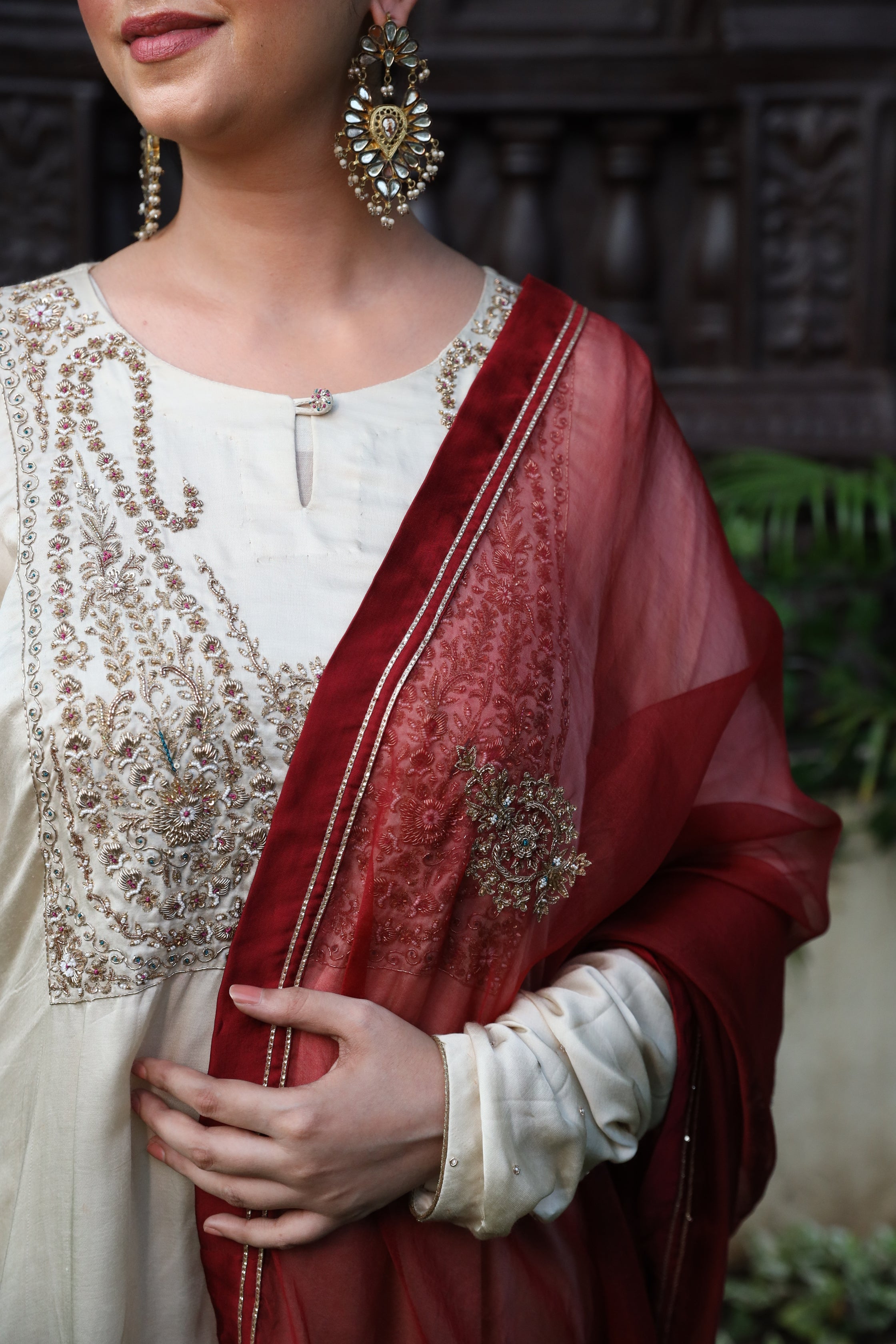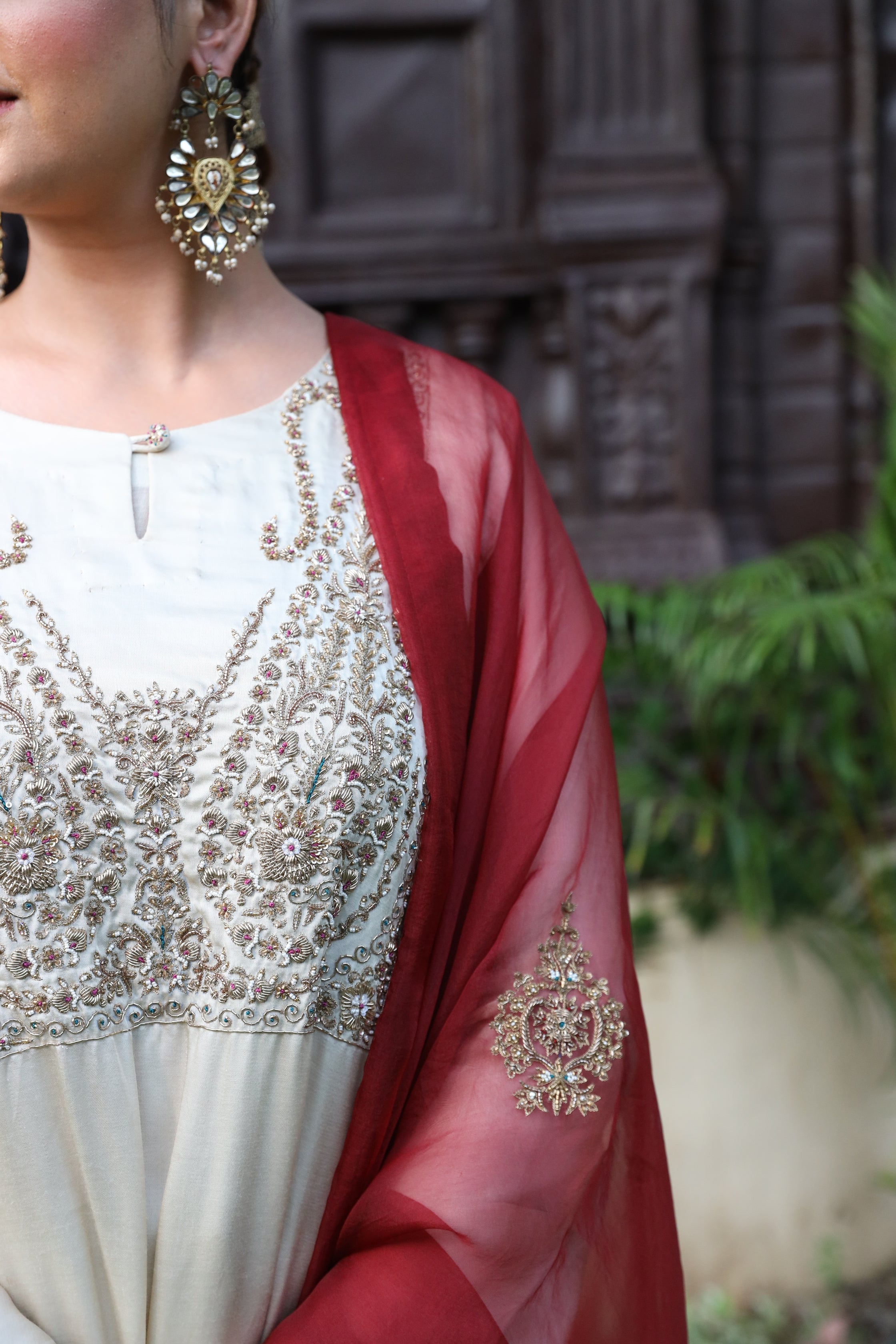 Fawn Kurta Set with Intricate Zardozi Work and Maroon Dupatta