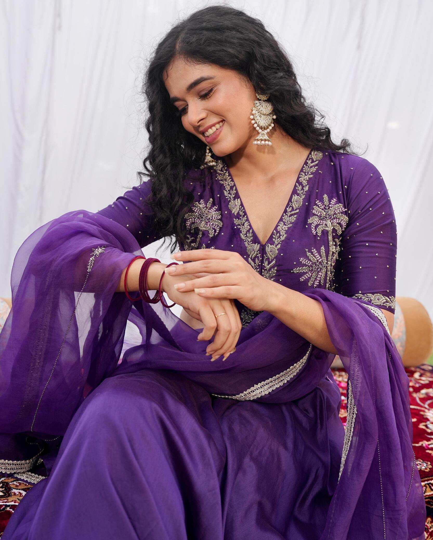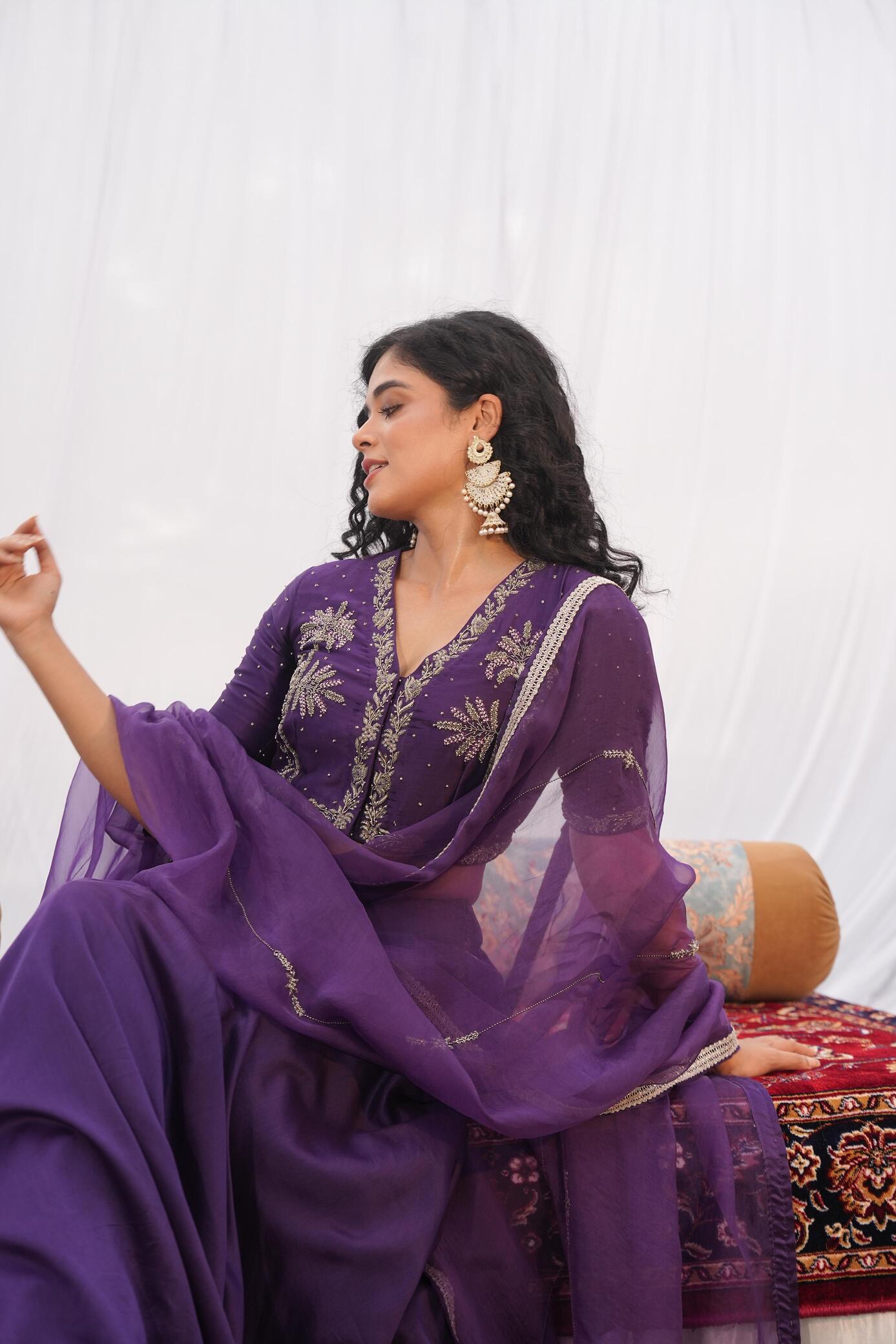 A lavish 3-piece Chanderi Silk and Organza set in Purple, finished with delicate zardozi and bead work. An opulent ensemble crafted for timeless sophistication.