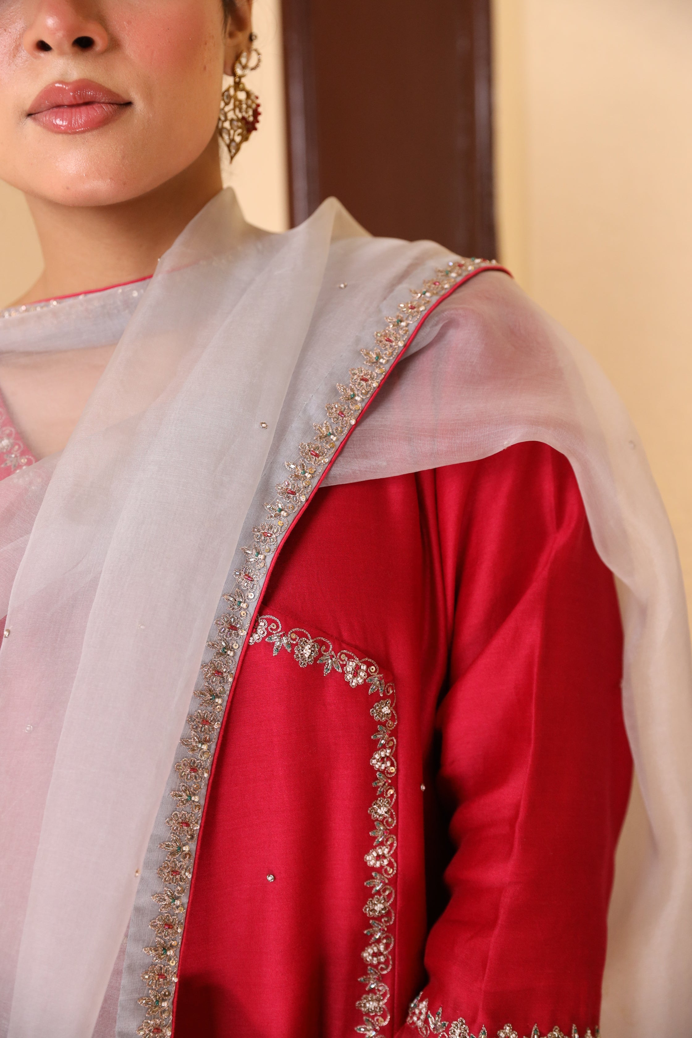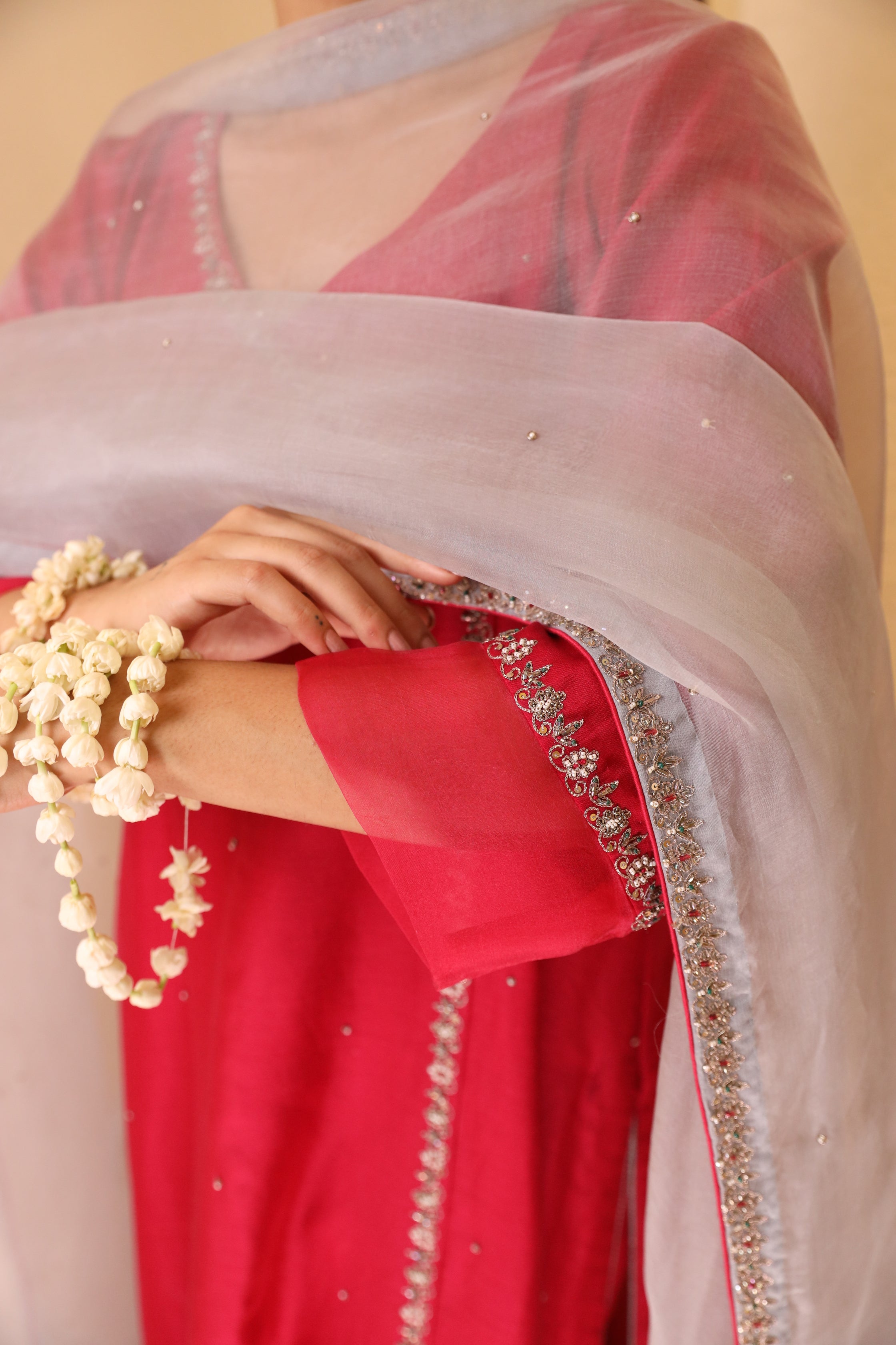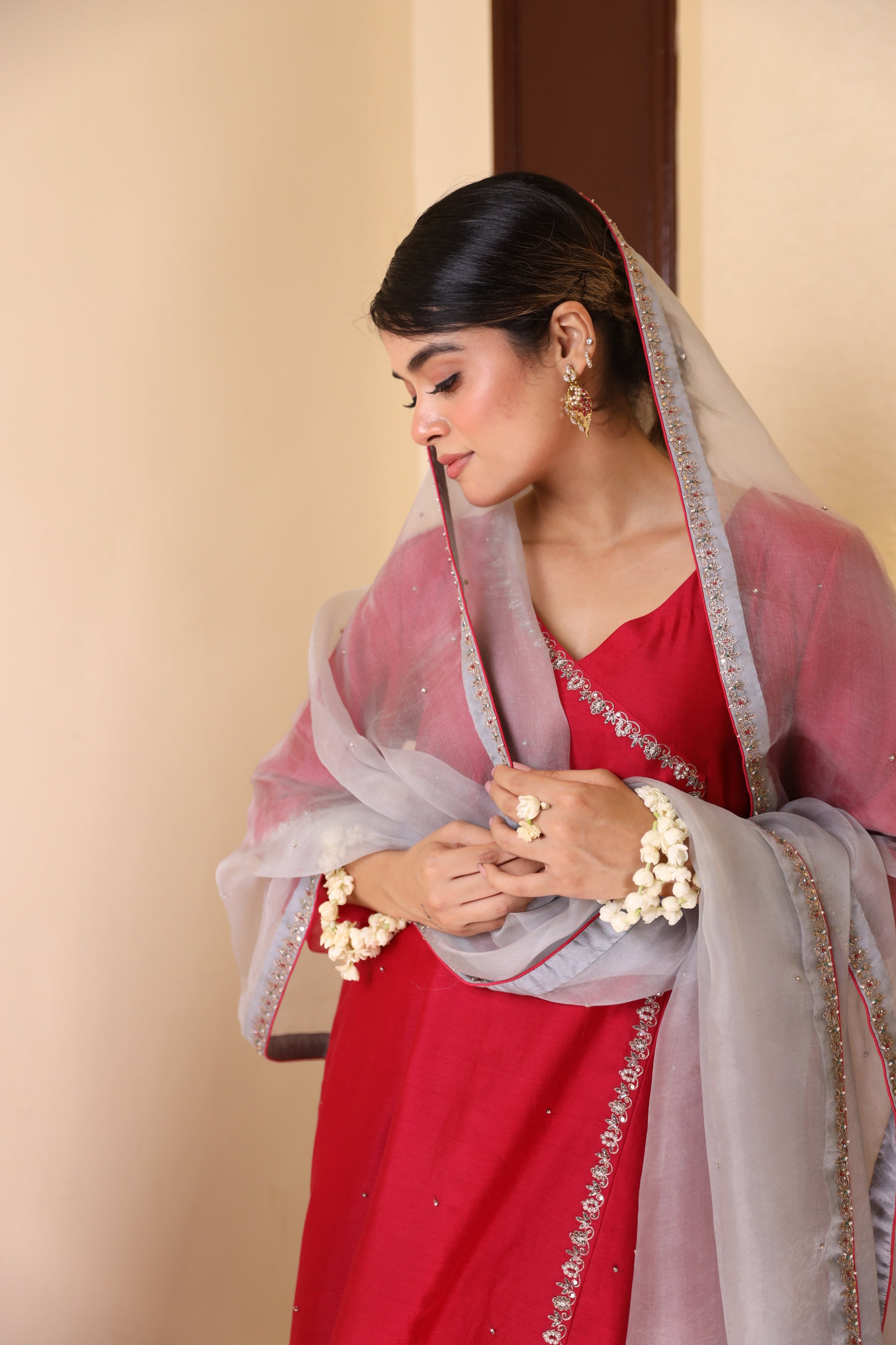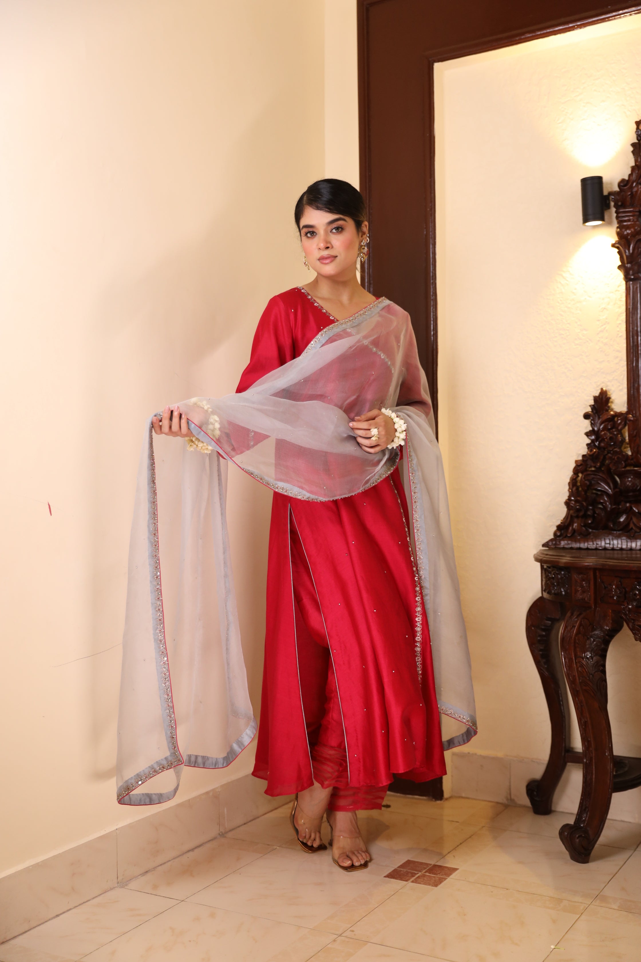 Red Kurta Set with Grey Dupatta and Zardozi Detailing