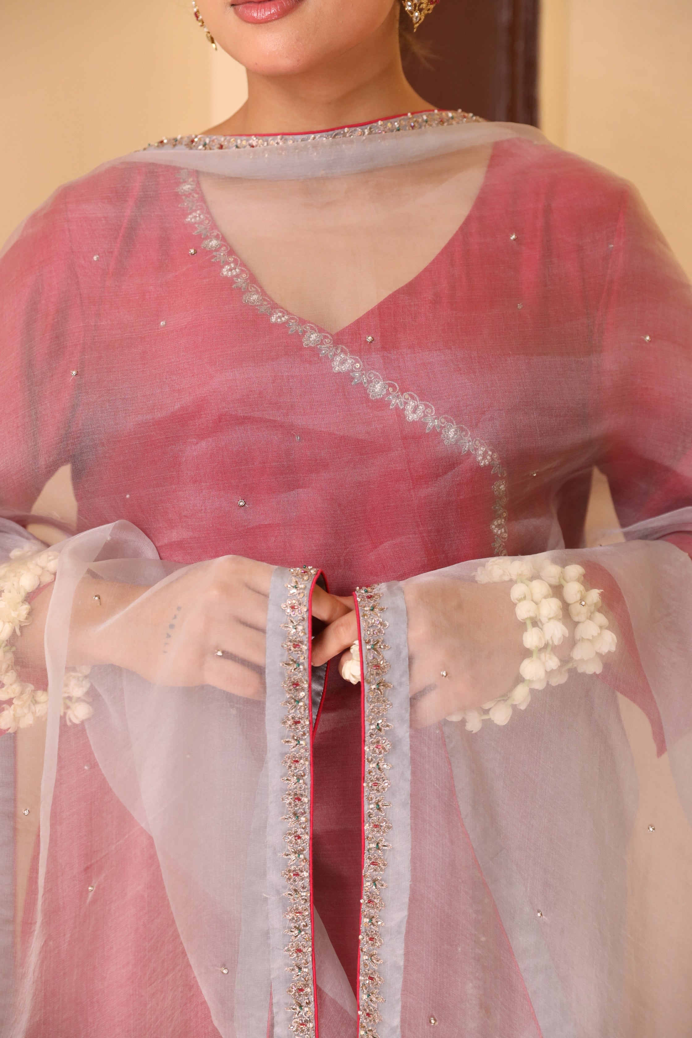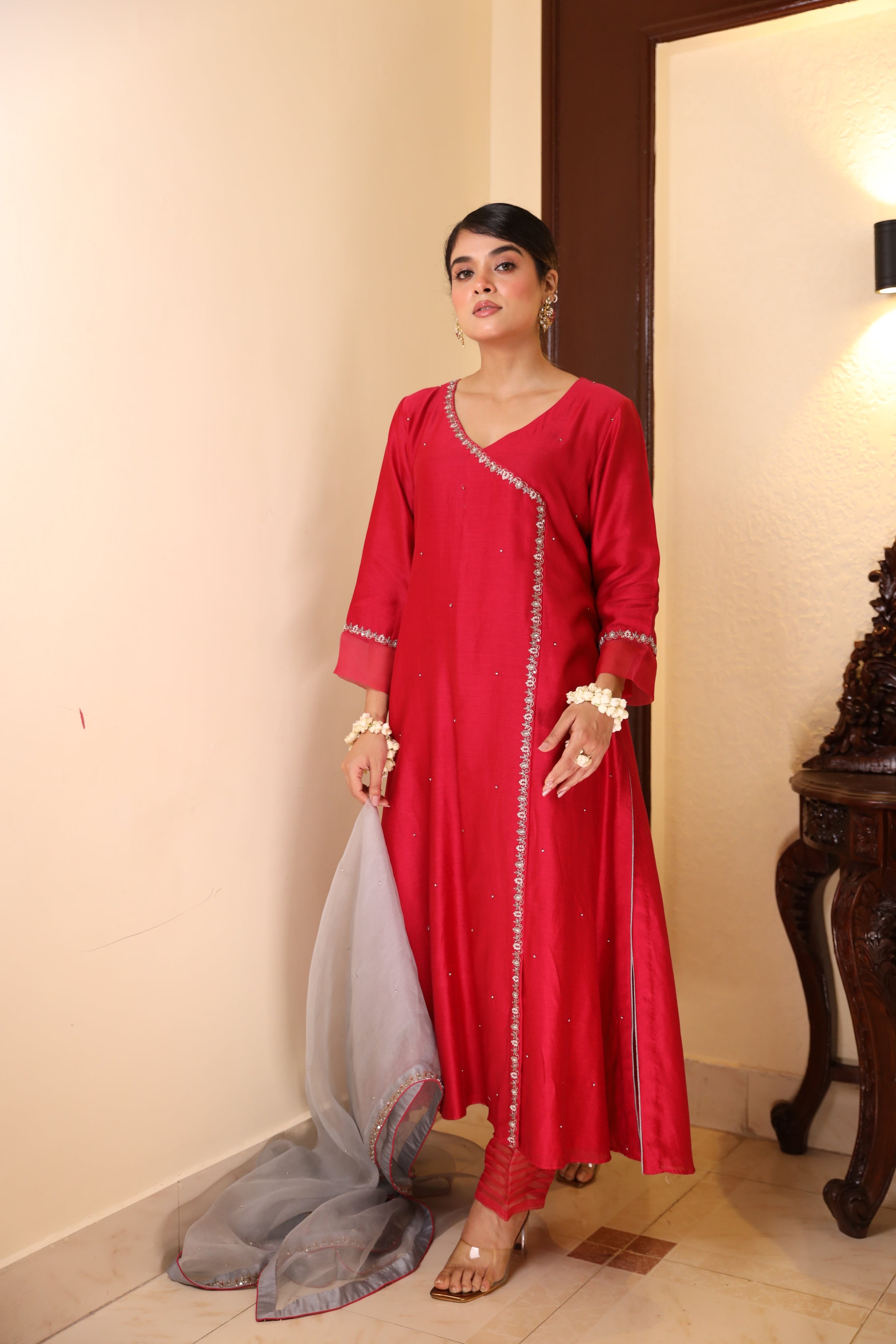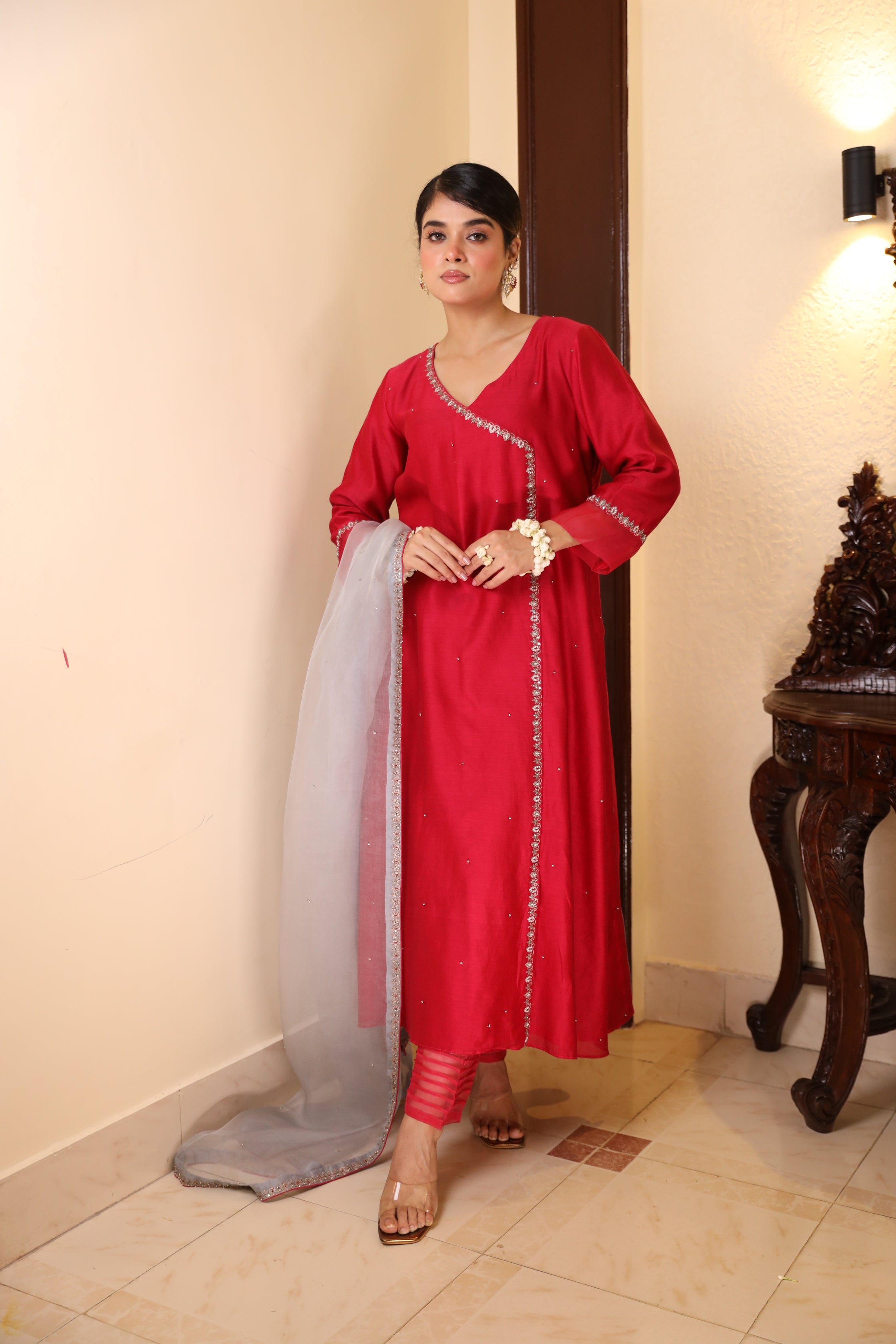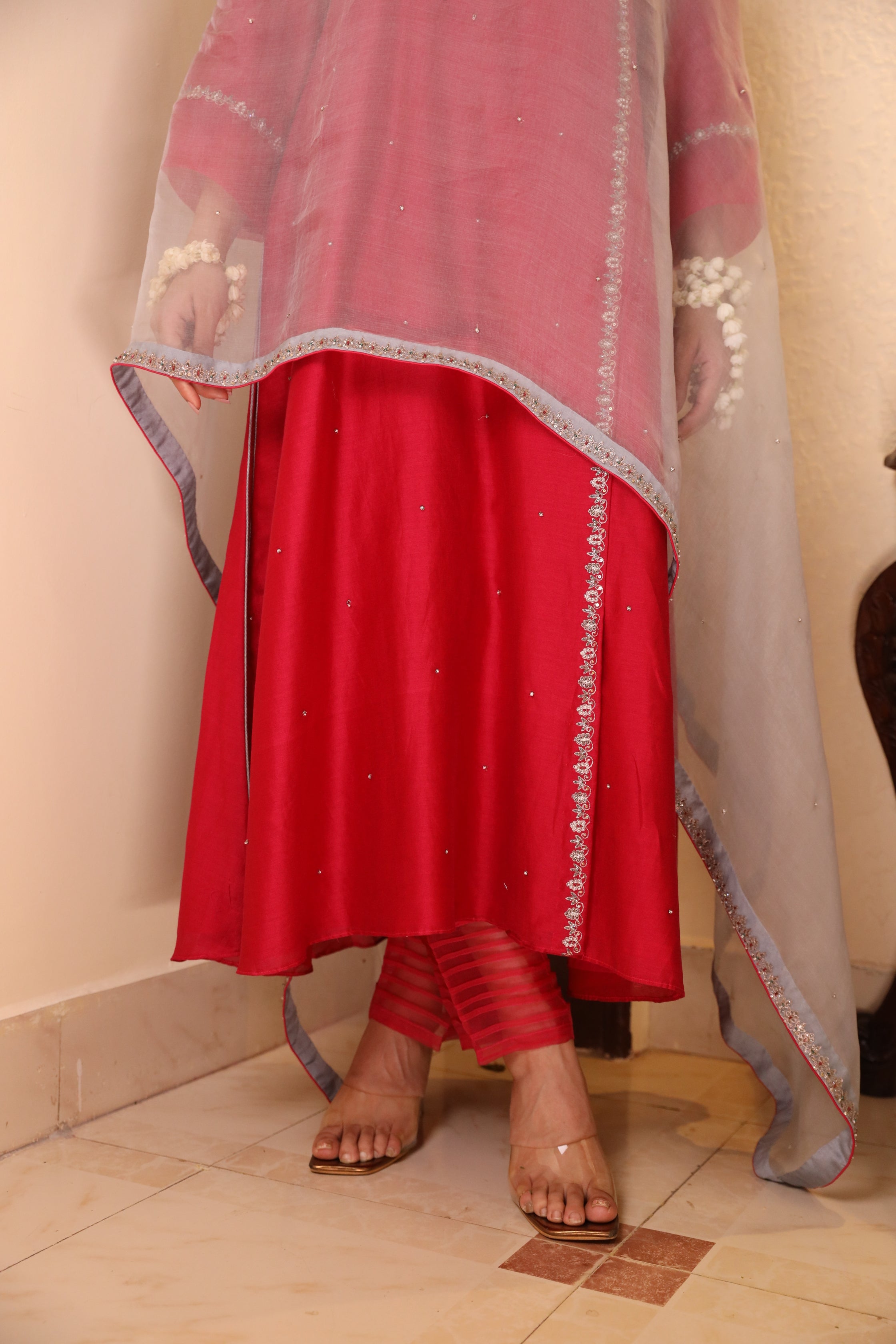 Red Kurta Set with Grey Dupatta and Zardozi Detailing